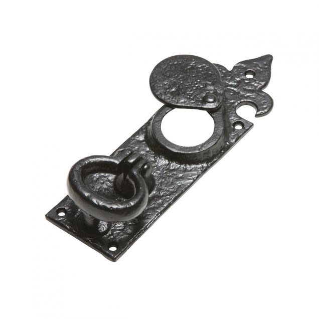 This antique door knocker features a ring knocker, a cylinder lock cover and a fleur-de-lis design. It is available in finishes including Dull Black, Armor Bright, Raw Iron, Pewter and Rust. These door knockers are sold as each.